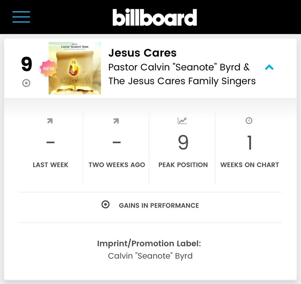 Calvin ‘Seanote’ Byrd has landed his latest release “Jesus Cares” on the Gospel Billboard Charts. According to reports, “Jesus Cares” is currently the #9 position above CeCe Winans’ hit single “Goodness of God”.